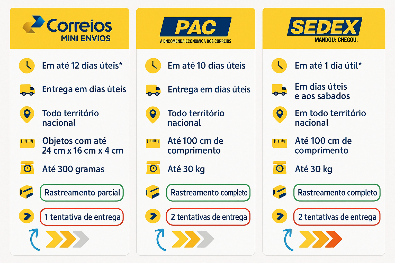 Importante: Para verificar o comparativo completo de tentativas e prazos entre as modalidades PAC e SEDEX, consulte a tabela a seguir.